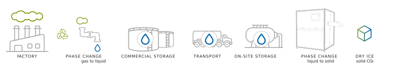 Het productieproces van droogijs is onderdeel van zogeheten carbon capture and utilization (CCU). Hierbij wordt CO₂ opgevangen bij industriële installaties of biogascentrales, vervolgens gerecycled en omgezet in droogijs.
